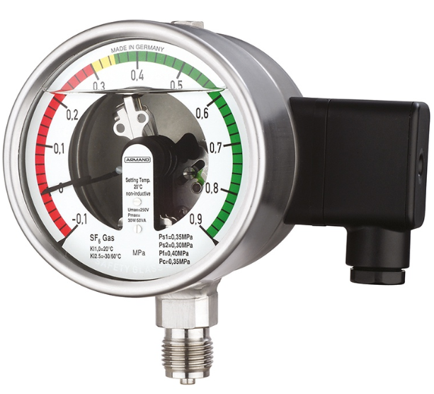 用于SF6-气体的气体密度计是配有电气附件的压力表,主要用于能源工业里的开关设备。它将压力测量和限位开关集合在一个装置中。通过一个特殊的补偿系统调整环境温度的影响。密度计按照使用个案中的填充压力、校正压力、开关点和环境温度进行校正。该仪器可提供 室内型号,也可提供用于户外的充气或充液型。测量系统与外壳焊接在一起,以保证泄露率达到或低于 10-5 mbar.l/s。