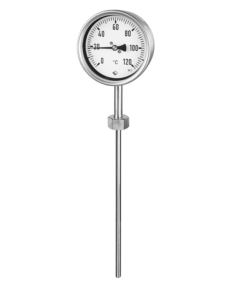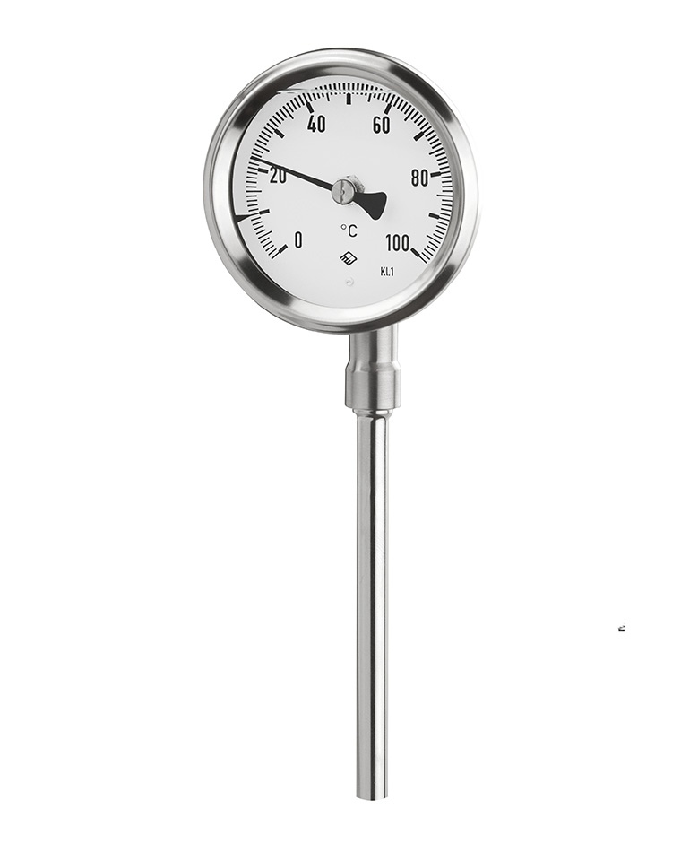 是一种指针式温度计。单独封闭的一定数量的气体因其压力与温度的关系可用于温度测量。测量单元由一个容器 、毛细管线和测量元件组成,其中容器中填充氮气或氦气,温度显示是通过机芯和指针来实现的。